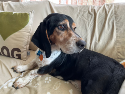 Fred is lovable and well-behaved – even potty trained! He equally loves to snuggle and be outside running about and tracking whatever has been in the yard. He does get vocal outside if dogs go by or are in the yard behind us. Fred needs some help learning how to walk on a leash. He pulls and is VERY strong. He also does this very neat trick of standing up on his hind legs.