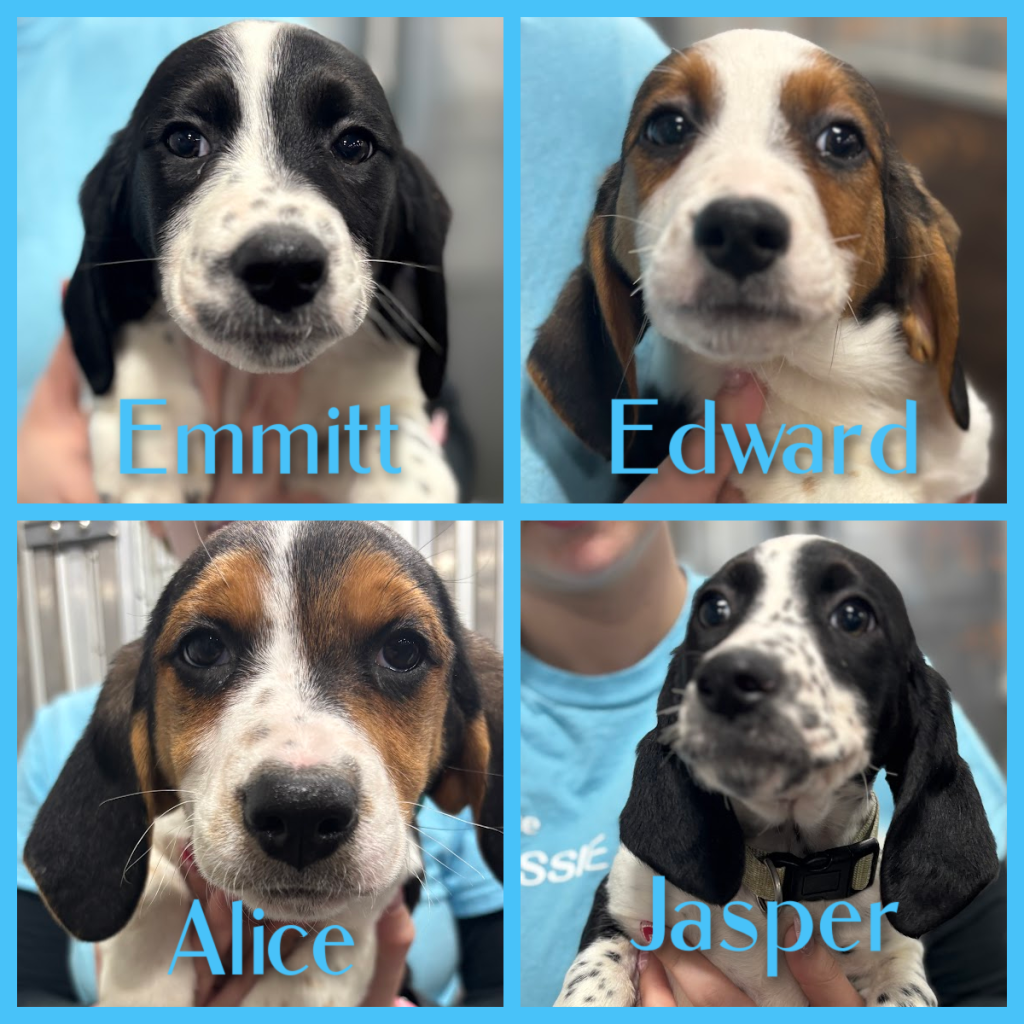 Edward-Eddie is your typical spunky little puppy. At about 12 weeks old, he is mastering the crate training. He sleeps in one throughout the night, quiet as a mouse! We’re working on housetraining, but he will still have a few accidents here and there (small puppy bladder!) He has an excellent hound nose and will smell the slightest hint of food, and is very treat motivated for training. He loves to play and chew on nylabones, but when he’s ready, he’s a pro at naptime cuddles. He’s good at keeping himself busy with the right toy. Eddie gets along great with the 2 resident dogs and the cat, too! Eddie will make a great addition to the right family who is ready for all the puppy shenanigans and love he has to give.