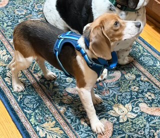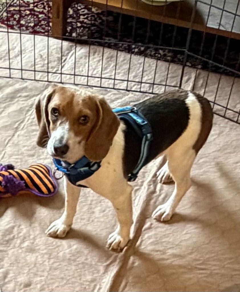 Blue is a not a Basset Hound, but we won’t hold that against him! He is a small tri-color Beagle, about 12” tall and weighing 15 pounds. His date of birth is 4/30/25.